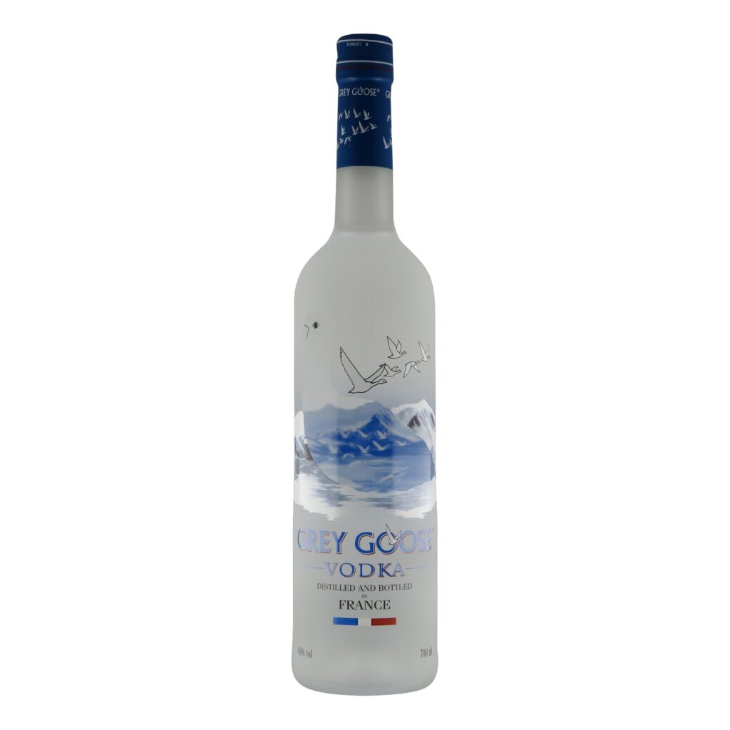 Die Flasche von Grey Goose Vodka wirkt sofort edel und modern. Das matte, leicht milchige Glas lässt den klaren Vodka schimmern, während die ikonische Gans vor einem hellblauen, winterlich anmutenden Hintergrund für einen unverwechselbaren Look sorgt. Die schlanke, hohe Form liegt gut in der Hand und macht auf jeder Bar eine herausragende Figur. Das minimalistische Etikett mit dezenten Grau- und Blautönen unterstreicht die luxuriöse Anmutung und vermittelt auf den ersten Blick, dass es sich hier um einen Vodka der Oberklasse handelt.