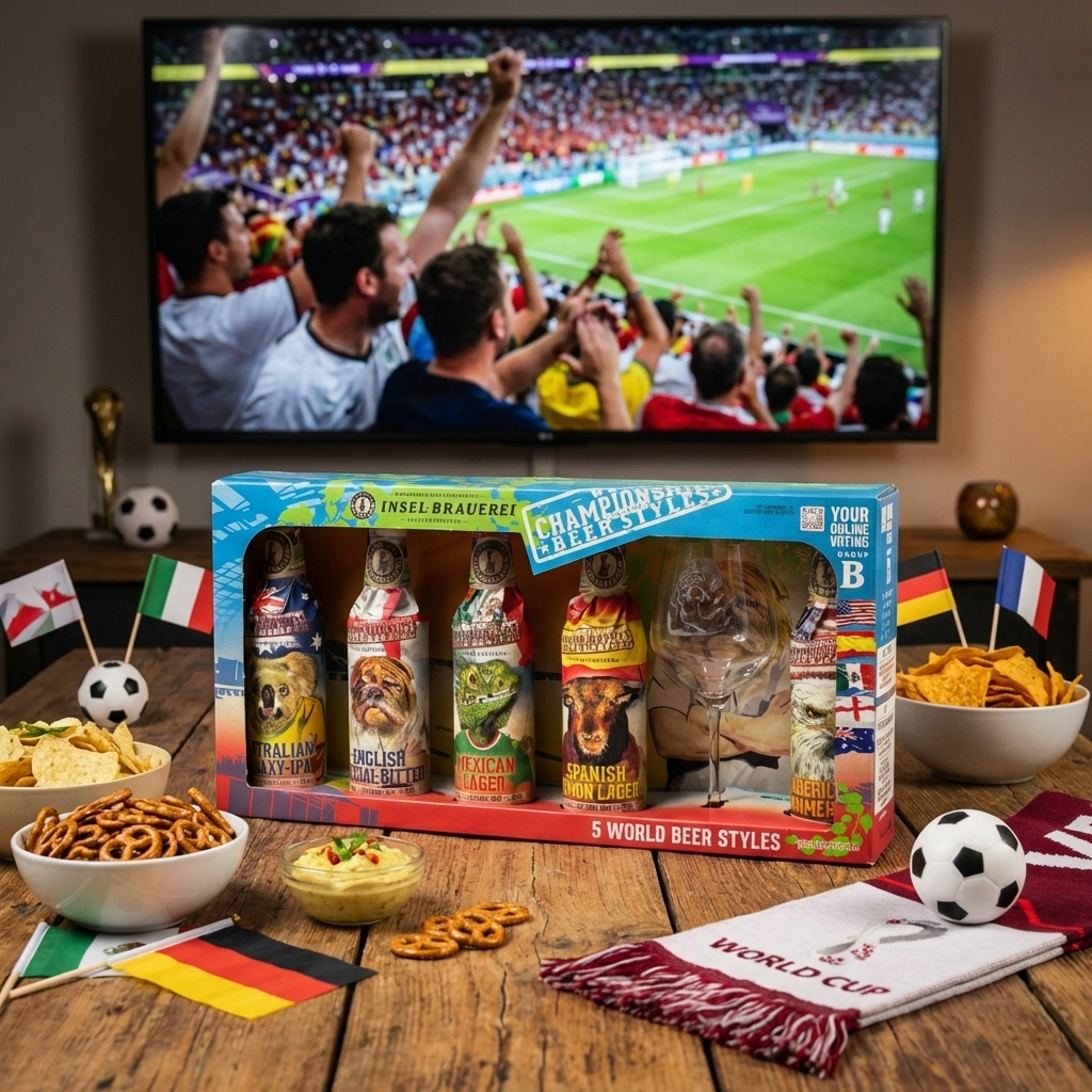 Mit diesem WM-Paket von der Insel-Brauerei holst du dir echte Stadionstimmung ins Wohnzimmer. Fünf charakterstarke Biere und ein stylisches Dogge-Glas machen jede Spielminute zum besonderen Genussmoment und sind gleichzeitig ein echter Hingucker in deinem Regal oder auf dem Couchtisch.